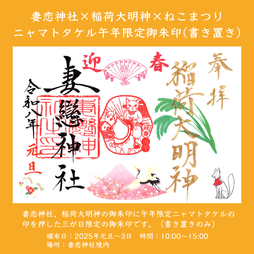 毎年恒例、妻恋神社にてニャマトタケル午年限定御朱印(書き置きタイプ)と、御朱印を書き入れた御朱印帳をご用意いたします。