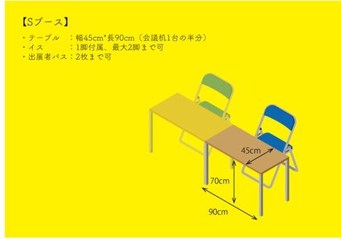 ・Sブースは会議机を2出展者で半分ずつご利用いただきます。半分の位置にテープなどの目印はございませんので、お手数ですが各自で計測しご利用ください。