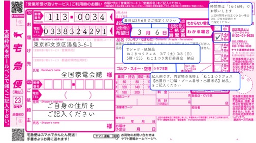 ・宅配搬入ご希望の方は、出展お申し込み時に【利用配送業者】と、お送りいただくお荷物の【予定個口数】をお知らせください。