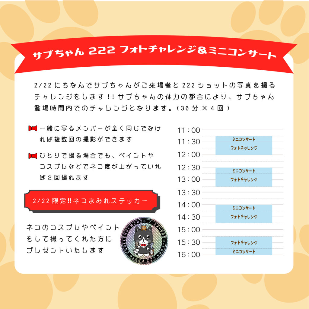 様々な楽しい企画をご用意しておりますので猫の日はぜひサブちゃんと一緒にお楽しみください♪